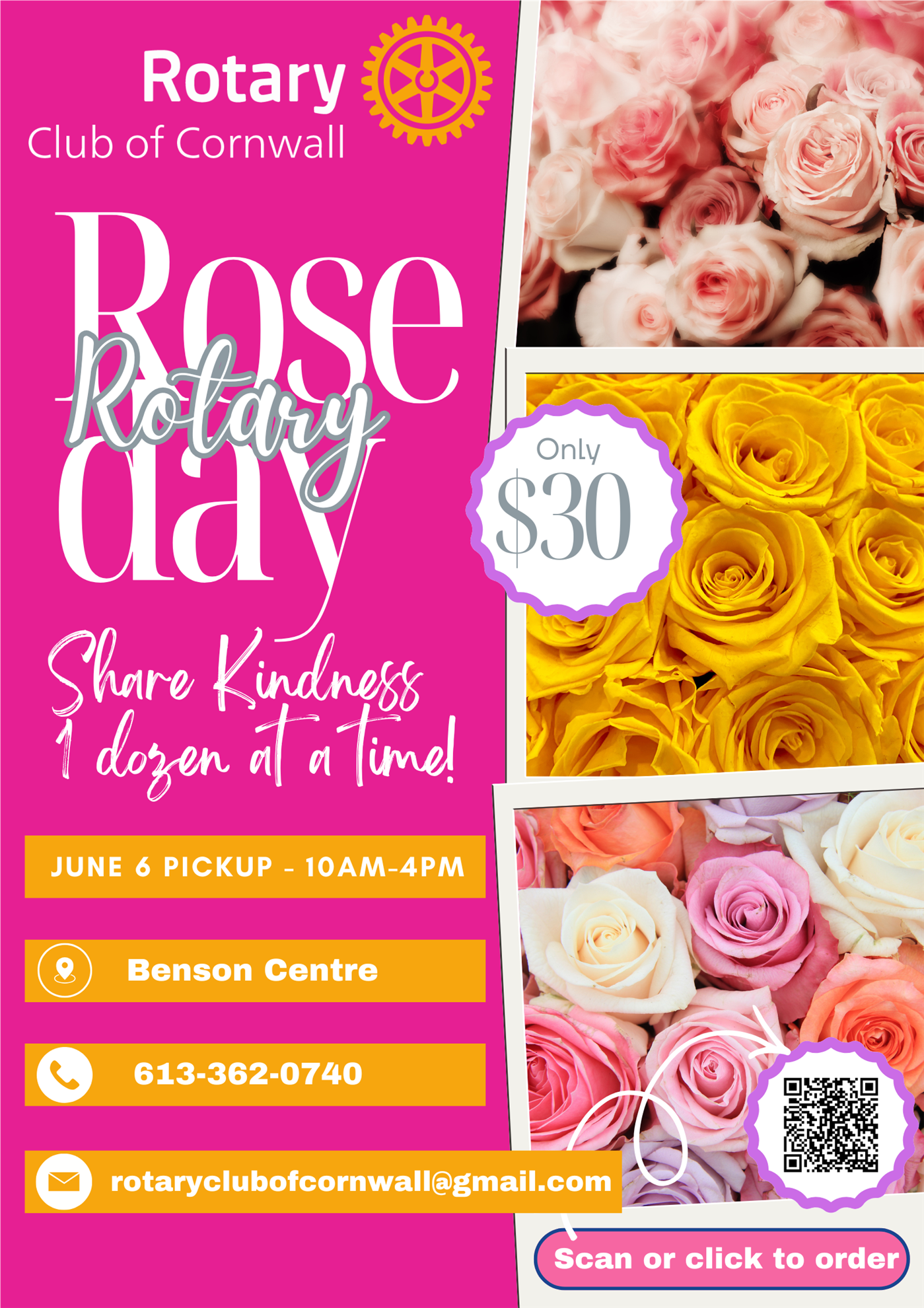 Support our Rotary Club’s Annual Rose Day by purchasing a dozen beautiful roses for someone special.